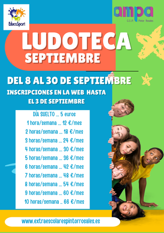 Durante el mes de Septiembre el horario de cole será solo por la mañana, es por ello por lo que para facilitar la conciliación del 8 al 30 de SEPTIEMBRE estará disponible la LUDOTECA en servicio de tarde con dos horarios